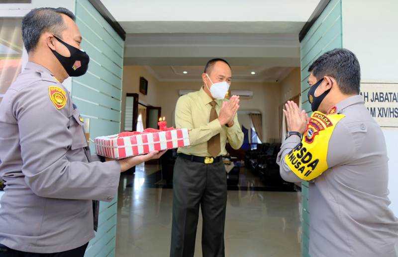 Kapolda bersama para Pejabat Utama (PJU) Polda Sulsel bertandang langsung ke Rumah Dinas (Rumdis) Pangdam, dengan membawa kue ulang tahun.