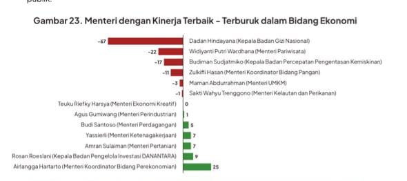 Sebaliknya, Andi Amran Sulaiman (Menteri Pertanian) justru mendapat penilaian positif, dengan skor +7, menempatkannya di jajaran menteri dengan kinerja ekonomi terbaik.