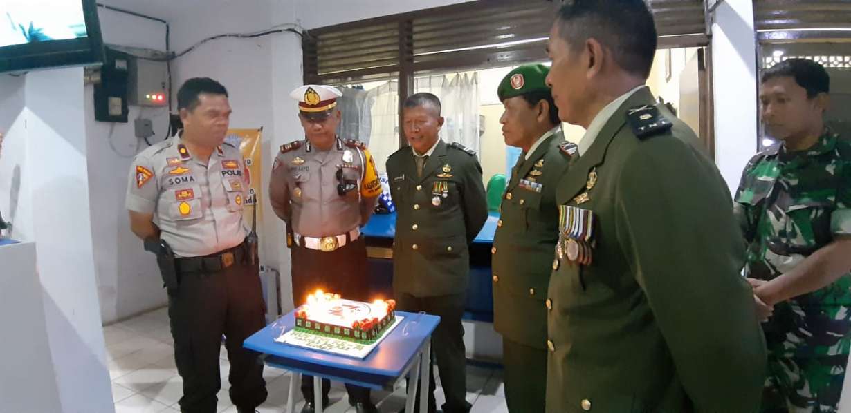 Personil Satlantas dipimpin Kasat Lantas Polres Sidrap, AKP Supriyanto memberikan kejutan kepada para TNI di Makodim 1420 Sidrap dengan membawakan kue ulang tahun.