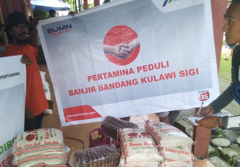 Bantuan awal yang diberikan berupa sembako yang terdiri dari beras, mie instan, gula, minyak goreng, garam, kopi dan susu untuk bayi. Pertamina juga memberikan 8 tabung LPG Bright Gas 5,5 kg untuk keperluan dapur umum. Bantuan ini diserahkan langsung ke Posko Banjir di Desa Bolapapu yang diterima oleh Badan Penanggulangan Bencana Daerah (BPBD) Kabupaten Sigi.