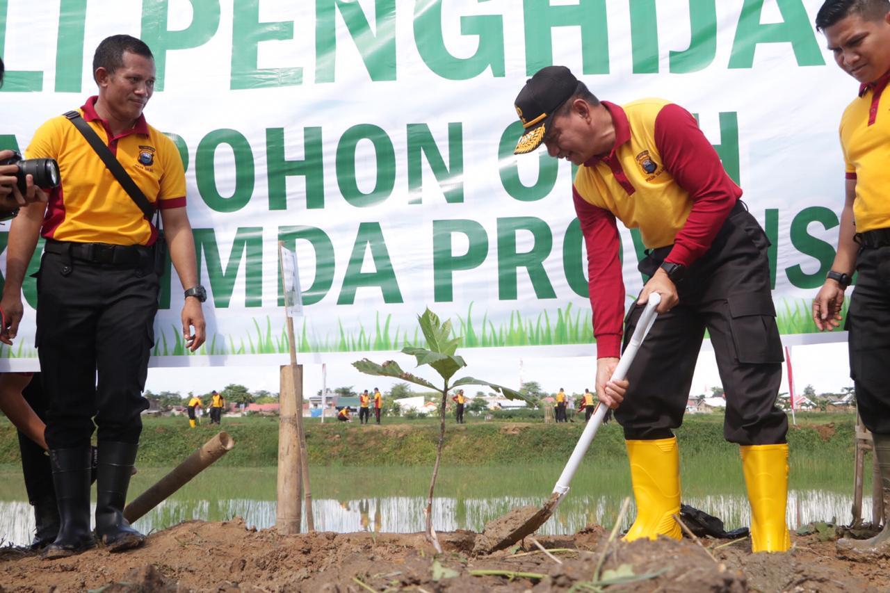 Berbagai macam bibit pohon diantaranya sukun, trembesi, glodogan, kencana, mahoni, mangga, durian dan rambutan, ditanam langsung oleh Kapolda berlserta Forkompinda dan personel TNI Polri.