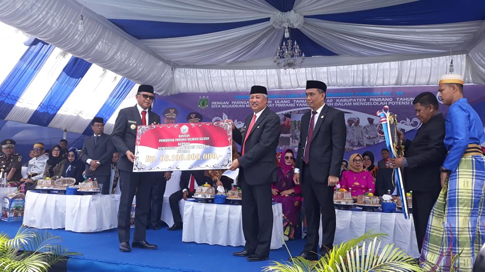 KILASSULAWESI.COM,PINRANG— Berkah pelaksanaan Hari Jadi Kabupaten Pinrang ke-60 di di Halaman Kantor Bupati Pinrang, Rabu 19 Februari, kemarin. Gubernur Sulawesi Selatan, Nurdin Abdullah menyerahkan langsung Bantuan Keuangan (BK) daerah bawahan sebanyak Rp 63,1 miliar ke Bupati Pinrang Irwan Hamid di HUT Pinrang ke-60 . Anggaran ini merupakan bentuk dukungan Pemerintah Provinsi (Pemprov) dengan pemerintah kabupaten atas progres pembangunan infrastruktur.