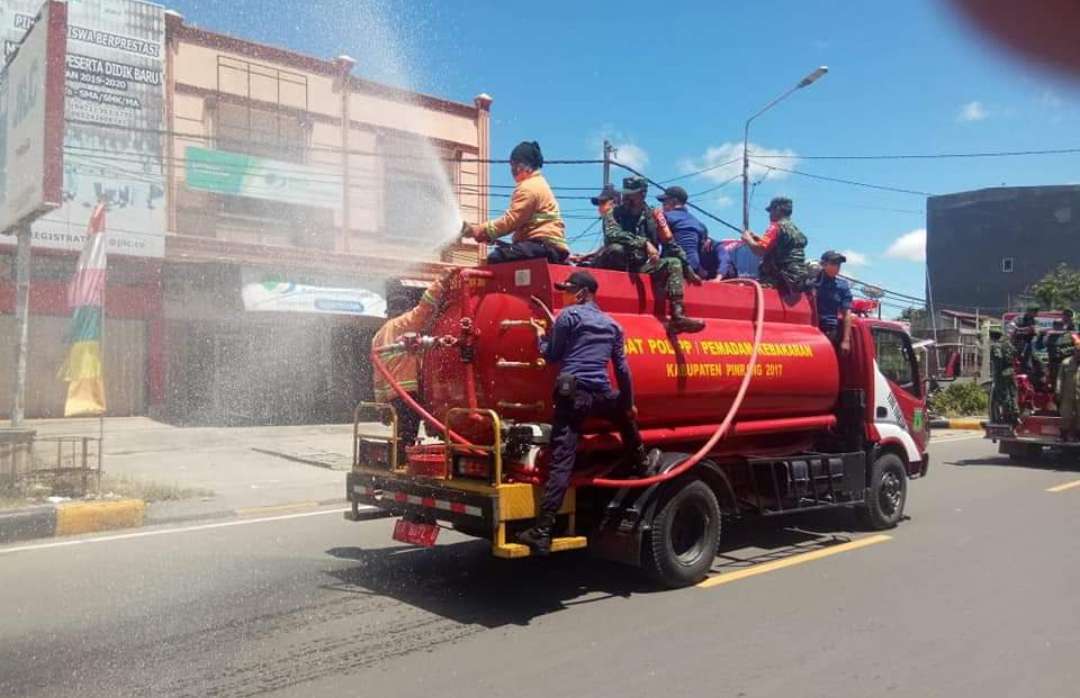 Penyemprotan disinfektan dengan menggunakan kendaraan pemadam kebakaran tersebut dalam rangka kesiapsiagaan dan langkah antisipasi penularan Covid-19 di Kabupaten Pinrang.