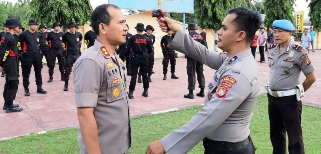 Maka salah satu pembuktian dan fakta dilapangan, maka Bagian Urusan Kesehatan Polres Mamuju Utara mengelar apel pagi sekaligus melakukan pengecekan suhu tubuh tiap personel, Selasa 24 Maret, pagi tadi halaman Mapolres Matra.