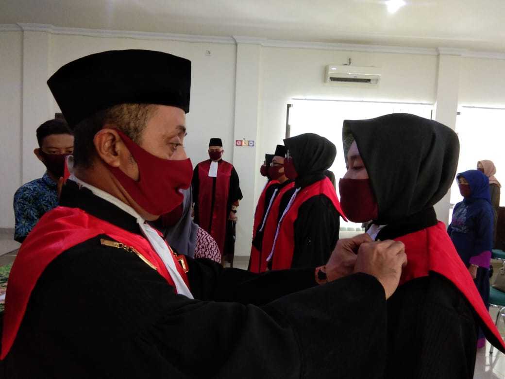 “Dengan berat hati, kemarin ketika ada agenda pelantikan ini. Saya terpaksa untuk membatasi tamu sanak keluarga. Mestinya hari ini hari yang bahagia bagi hakim baru kita. Namun, disamping itu kita haru taat imbaun. Dan bersama-sama memerangi wabah covid ini,”ujar Farid saat sambutan.