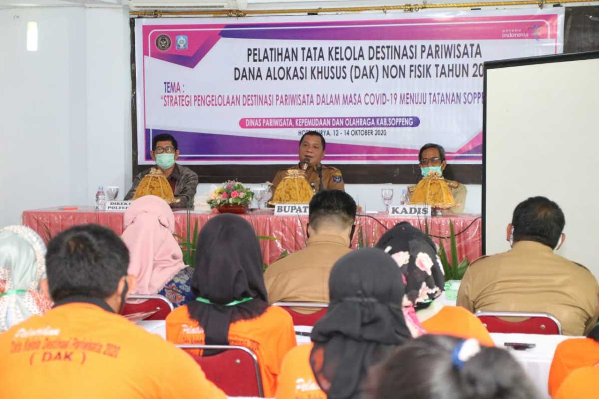 KILASSULAWESI.COM, SOPPENG — Dinas Pemuda, Olahraga dan Pariwisata (Dispopar) Kabupaten Soppeng menggelar pelatihan tata kelola destinasi pariwisata dana alokasi khusus (DAK) dan non fisik 2020, di Hotel Surya, Jalan Wijaya, Senin 12 Oktober. Kegiatan berlangsung tiga hari sampai tanggal 14 Oktober, dibuka oleh Pjs Bupati Soppeng Idam Kadir.