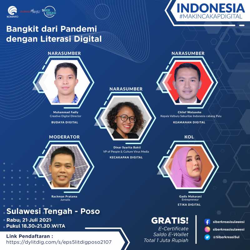 KILASSULAWESI.COM,POSO– Rangkaian Program Literasi Digital “Indonesia Makin Cakap Digital” di Sulawesi, yang diselenggarakan oleh Kementerian Komunikasi dan Informatika Republik Indonesia dan Siberkreasi bersama Dyandra Promosindo, dilaksanakan secara virtual pada 21 Juli 2021 di Kota Poso, Sulawesi Tengah. Kolaborasi ketiga lembaga ini dikhususkan pada penyelenggaraan Program Literasi Digital di wilayah Sulawesi. Adapun tema kali adalah “Bangkit dari Pandemi dengan Literasi Digital”.