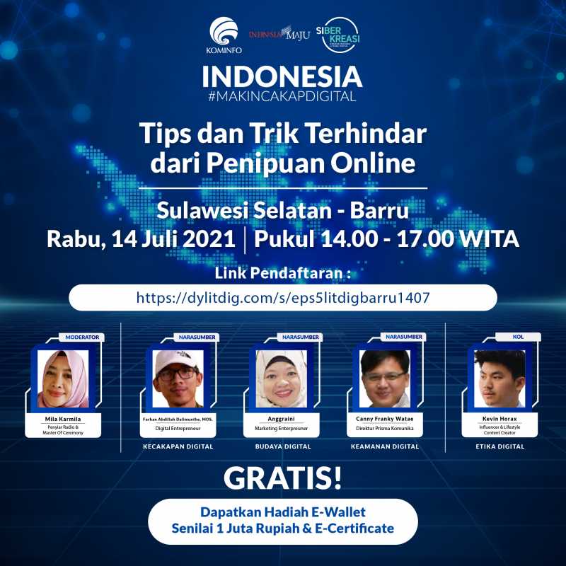 KILASSULAWESI.COM,BARRU– Sebanyak 1033 peserta mengikuti Rangkaian Program Literasi Digital “Indonesia Makin Cakap Digital” di Sulawesi, yang diselenggarakan oleh Kementerian Komunikasi dan Informatika Republik Indonesia dan Siberkreasi bersama Dyandra Promosindo, dilaksanakan secara virtual pada 14 Juli 2021 di Barru, Sulawesi Selatan. Kolaborasi ketiga lembaga ini dikhususkan pada penyelenggaraan Program Literasi Digital di wilayah Sulawesi. Adapun tema kali adalah “Tips dan Trik Terhindar dari Penipuan Online”.