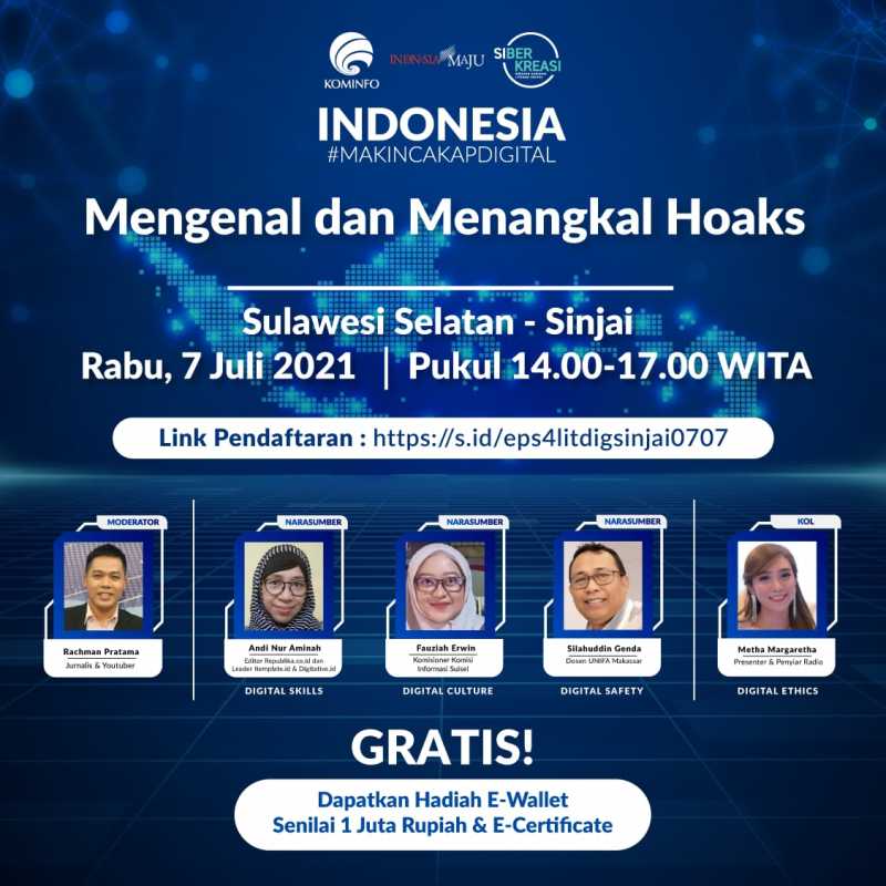 Program kali ini menghadirkan empat narasumber yang terdiri dari editor Republika.co.id sekaligus pimpinan Itemplate.id & Digitative.id Andi Nuraminah, pembawa acara sekaligus penyiar radio Metha Margaretha, Komisioner Komisi Informasi Sehat Fauziah Erwin, serta dosen Universitas Fajar Makassar Silahuddin Genda. Adapun yang bertindak sebagai moderator adalah Rachman Pratama selaku jurnalis dan naravlog. Rangkaian Program Literasi Digital “Indonesia Makin Cakap Digital” di Sulawesi menargetkan peserta sebanyak 57.550 orang.