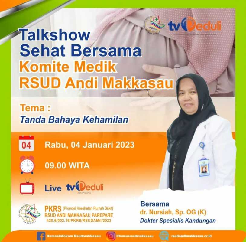 Temanya membahas terkait tanda bahaya kehamilan pada ibu hamil. Talkshow ini di bawakan oleh ahli kandungan dr. Nursiah, Sp.Og.