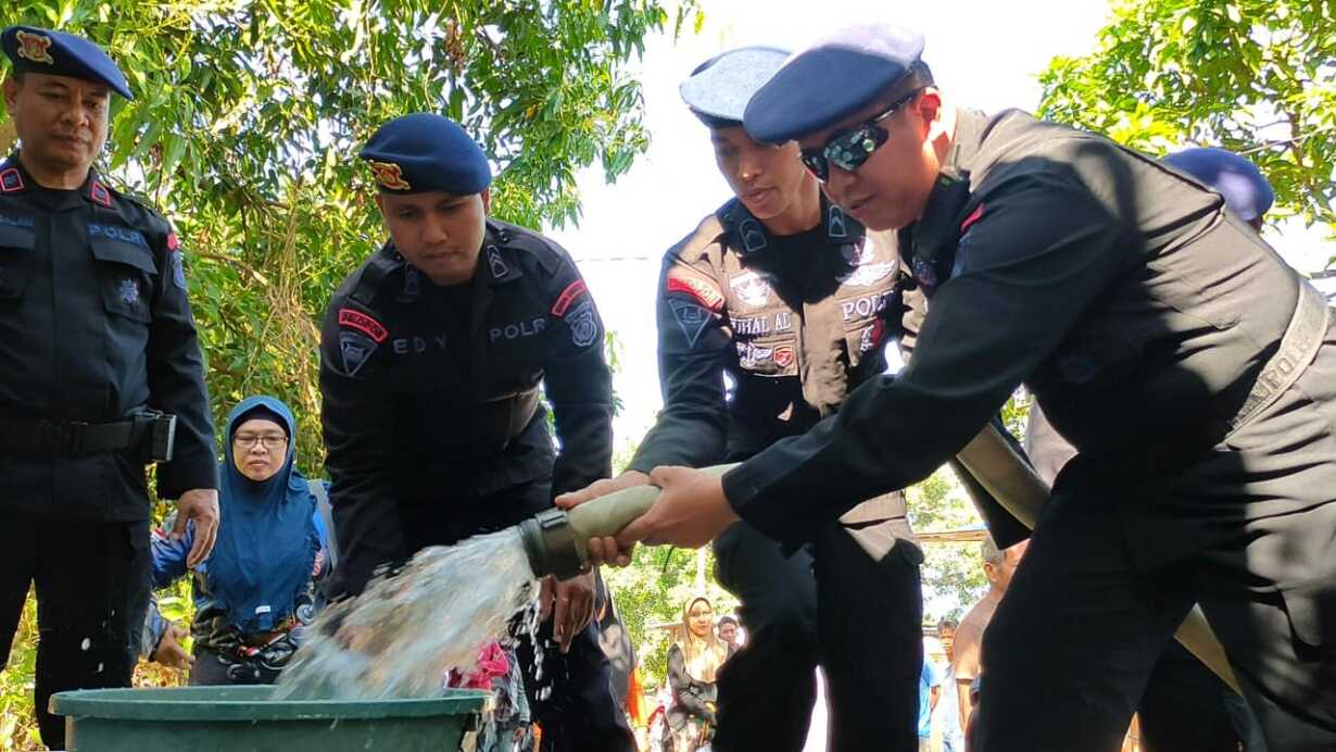 PAREPARE,KILASSULAWESI- Brimob bersama PDAM peduli warga yang terdampak kekeringn dengan distribusi air bersih di Kelurahan Bumi Harapan, Kecamatan Bacukiki Barat, Kota Parepare.