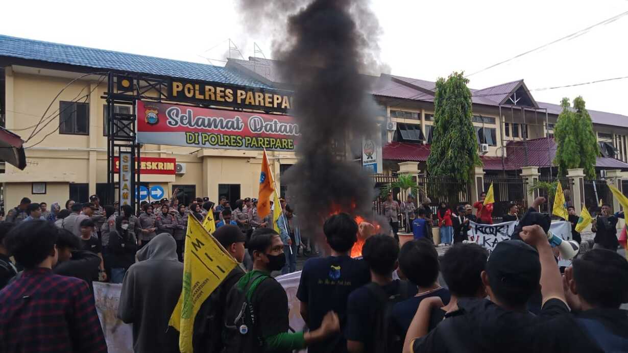 PAREPARE, KILASSULAWESI-Puluhan Mahasiswa yabg tergabung dalam Pengurus Cabang Pergerakan Mahasiswa Islam Indonesia (PC-PMII) Kota Parepare, Selasa, 28 November 2023, menggelar aksi unjuk rasa di depan Mapolres Parepare. Aksi yang diwarnai aksi bakar ban tersebut, menuntut agar kepolisian menuntaskan kasus korupsi dana dinas kesehatan (Dinkes).