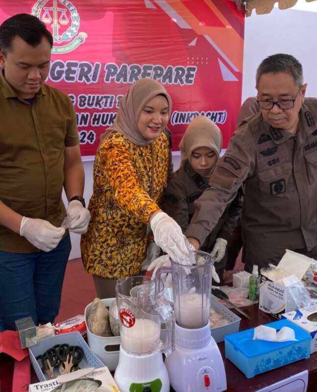 PAREPARE, KILASSULAWESI– Kejaksaan Negeri (Kejari) Parepare memusnahkan barang bukti narkotika jenis sabu sebanyak 357,6 gram, ganja 444.690 gram, dan ekstasi 1.630 butir atau senilai Rp 1,6 miliar dari 41 perkara. Pemusnahan narkotika itu dilakukan dengan cara diblender di halaman Kantor Kejari Parepare.