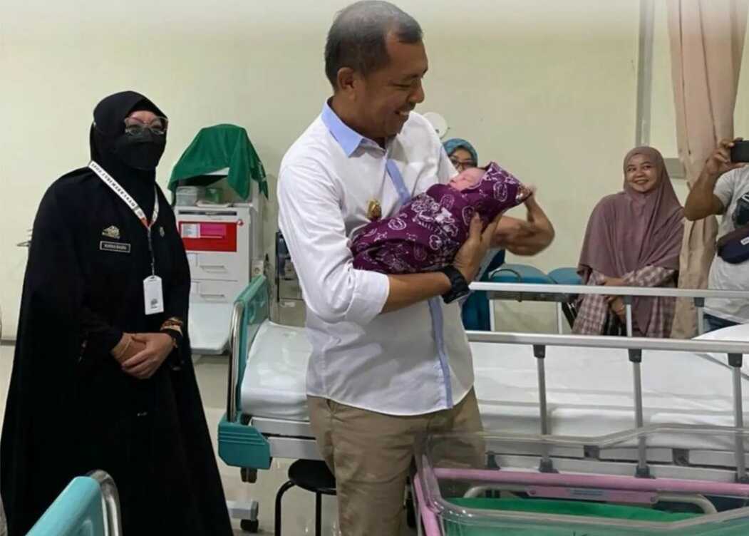 PAREPARE, KILASSULAWESI–Penjabat Wali Kota Parepare, Akbar Ali mengendong salah satu bayi dari dua anak yang lahir tepat pada hari ulang tahun ke-64 Kota Parepare, Sabtu, 17 Februari 2024, di RSUD Andi Makkasau, Parepare.