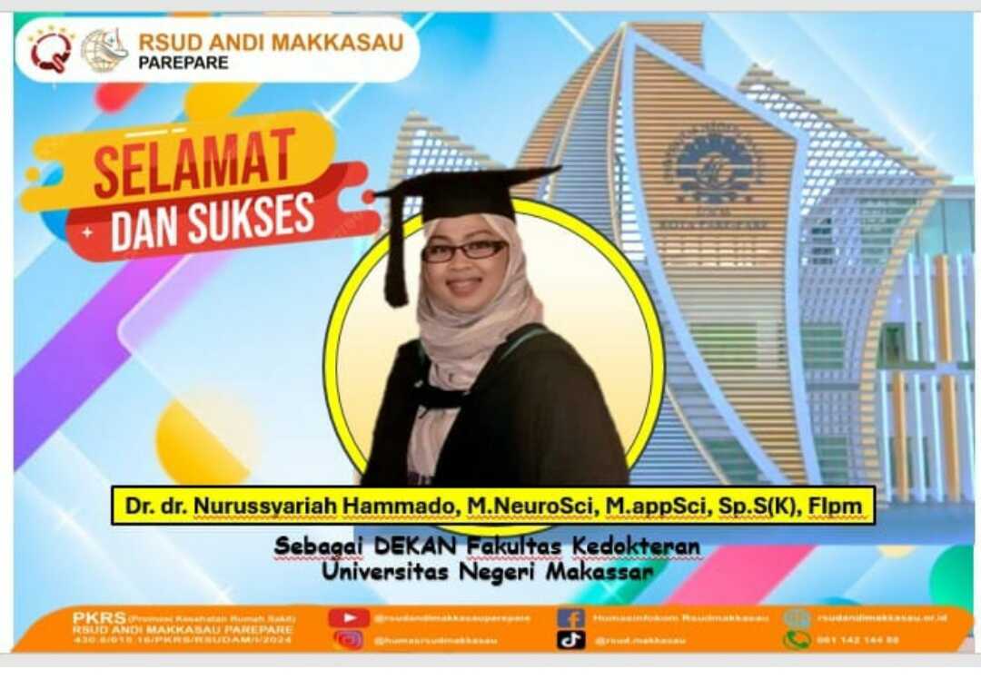 Ucapan selamat itu disampaikan melalui akun media sosial resmi RSUD Andi Makkasau, Senin, 19 Februari 2024. “Selamat dan sukses kepada Dr. dr. Nurussyariah Hammado, M. NeuroSci, M.AppSci, Sp. S (K), FIPM, atas pelantikkannya menjadi Dekan Fakultas Kedokteran Universitas Negeri Makassar,” tulis RSUD Andi Makkasau di akun media sosial resminya.