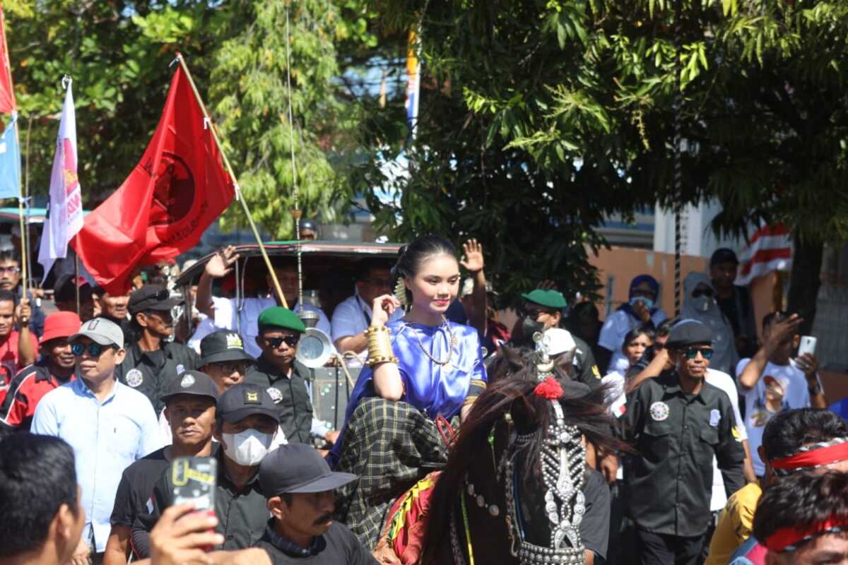 Dari lapangan Pancasila, pasangan Bebas Manggazali-Siti Rahmawati mengendarai kuda Pattudu menuju KPUD Polman. Keduanya yang mengenakan baju putih, kompak menaiki delman.
