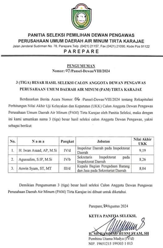 Hal itu termuat dalam surat pengumuman nomor: 07/Pansel-Dewas/VIII/2024 tentang rekapitulasi perhitungan nilai akhir uji kelayakan dan kepatutan (UKK) calon anggota Dewas terpilih Perumda Air Minum (PAM) Tirta Karajae.