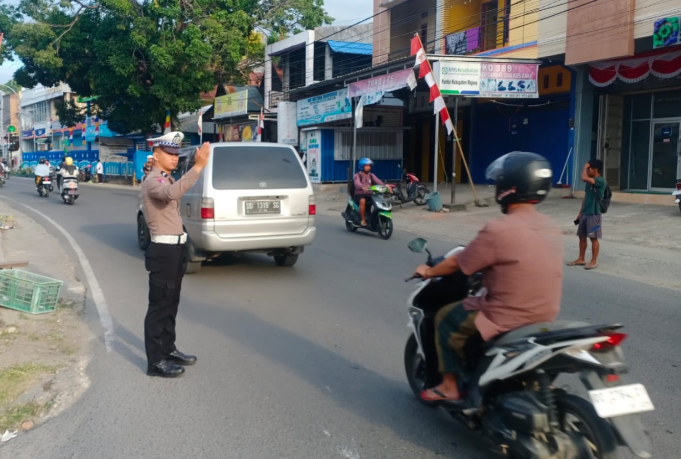 MAJENE – Personel Satuan Lalu Lintas Polres Majene diterjunkan ke sejumlah ruas jalan utama dalam Kota Majene untuk melaksanakan kegiatan Commander Wish, Kamis, 14 Agustus 2025.