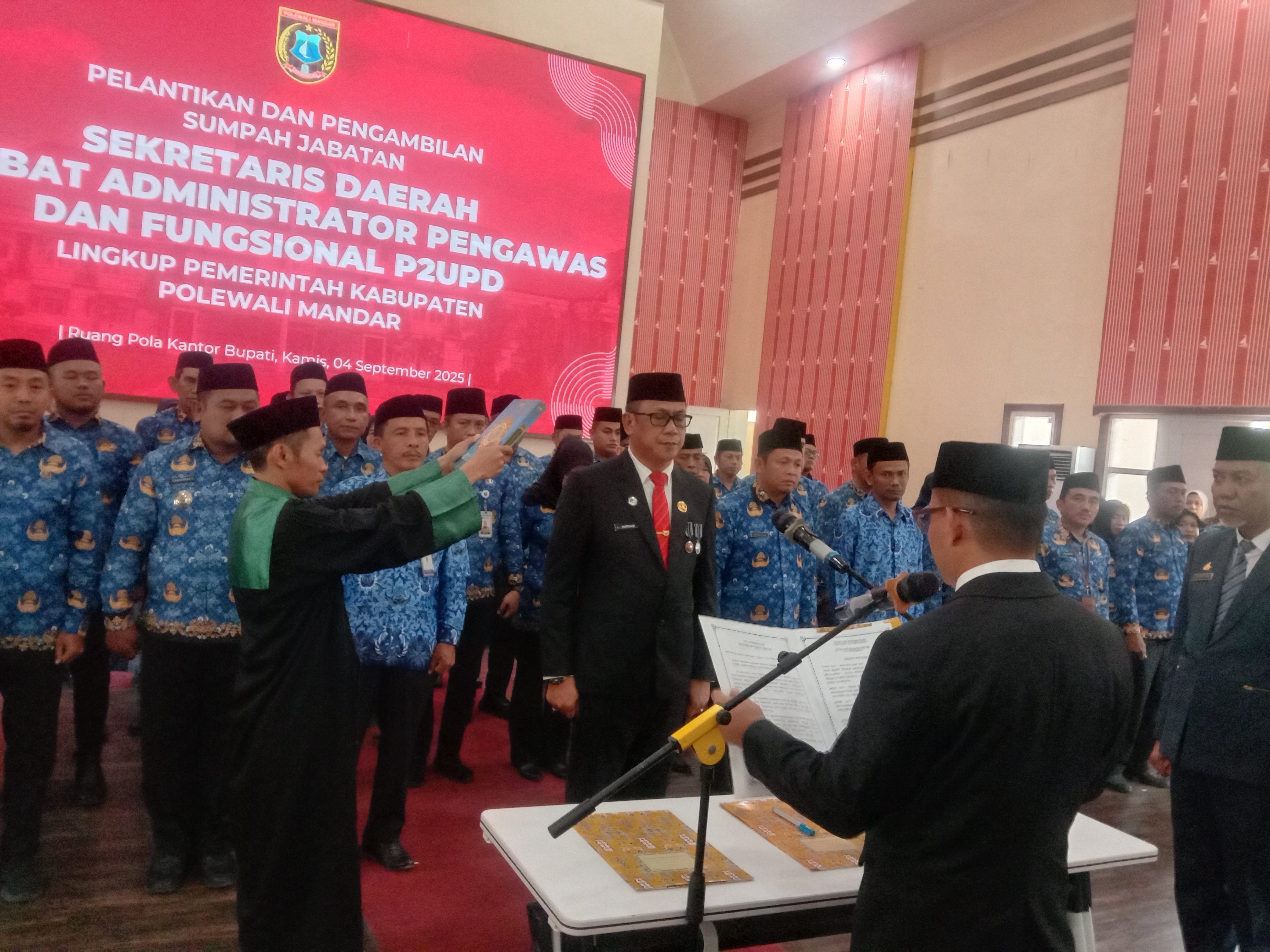 POLMAN–Bupati Polman H.Samsul Mahmud secara resmi melantik Sekertaris daerah ( Sekda) definitif kabupaten Polman Nursaid Mustafa yang berlangsung diruang pola kantor Bupati Polman Kamis 4 September 2025.