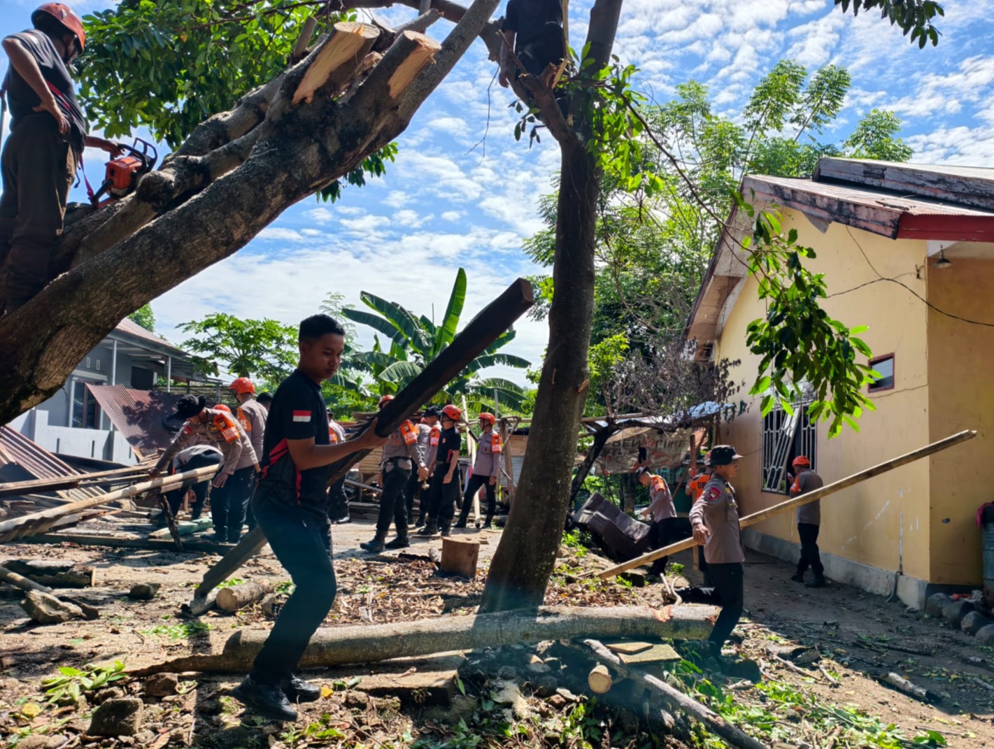 Dengan menggunakan chainsaw dan perlengkapan keselamatan, personel Brimob bersama petugas BPBD dan warga setempat bahu-membahu membersihkan batang pohon yang menutupi akses jalan.